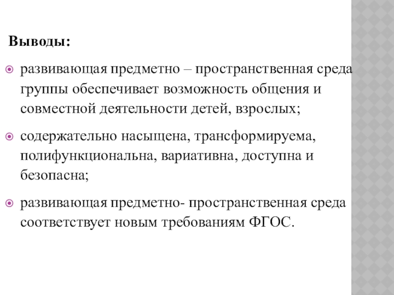 содержательно насыщена, трансформируема, полифункциональна, вариативна, доступна и безопасна;