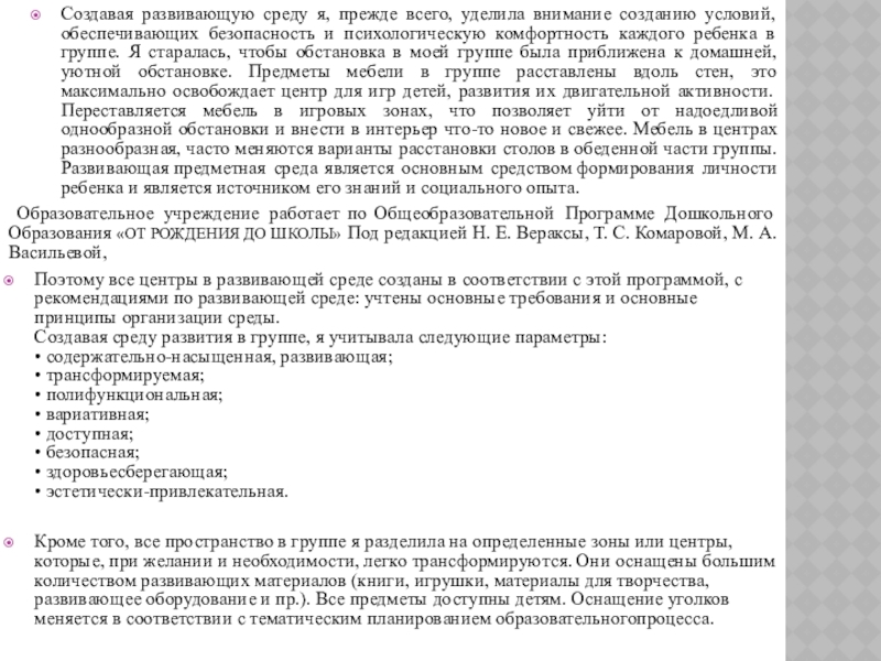 Слайд 2Создавая развивающую среду я, прежде всего, уделила внимание созданию условий, обеспечивающих