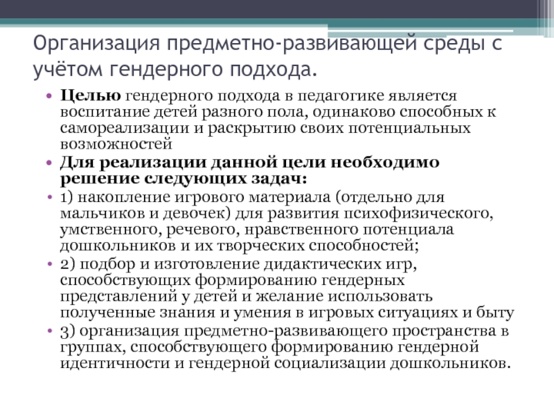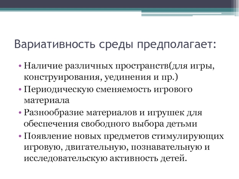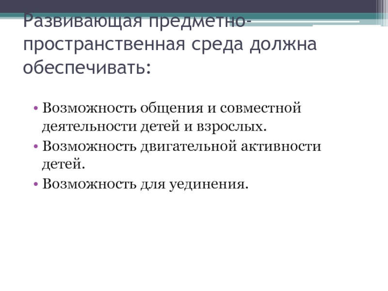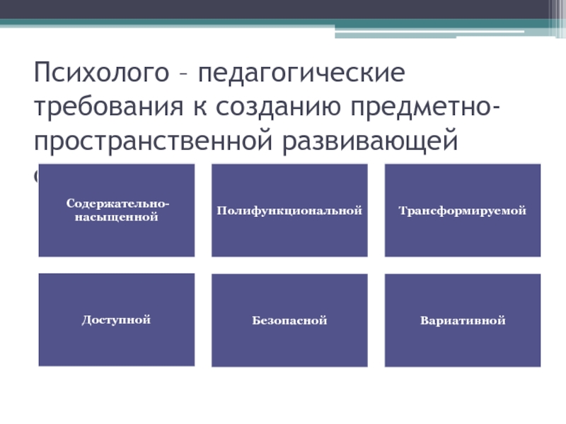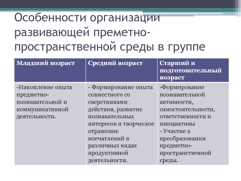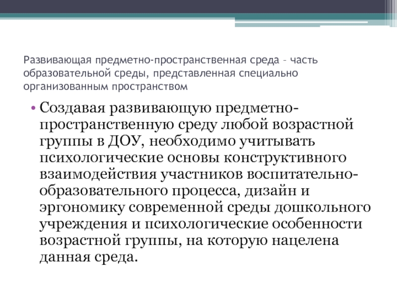 Создавая развивающую предметно-пространственную среду любой возрастной группы в ДОУ, необходимо учитывать психологические основы конструктивного взаимодействия участников воспитательно-образовательного процесса, дизайн и эргономику современной среды дошкольного учреждения и психологические особенности возрастной группы, на которую нацелена данная среда.