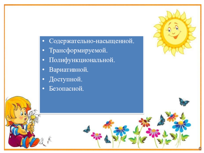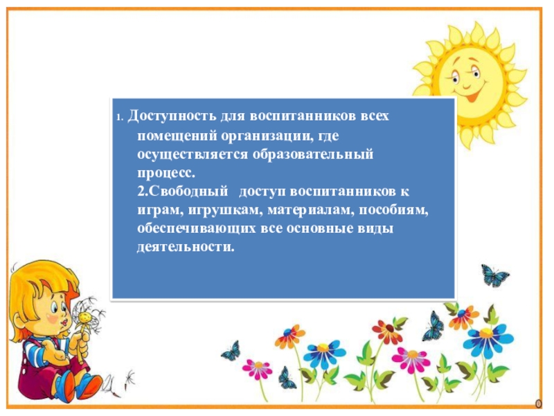 1. Доступность для воспитанников всех помещений организации, где осуществляется образовательный процесс. 2.Свободный доступ воспитанников к играм, игрушкам, материалам, пособиям, обеспечивающих все основные виды деятельности.