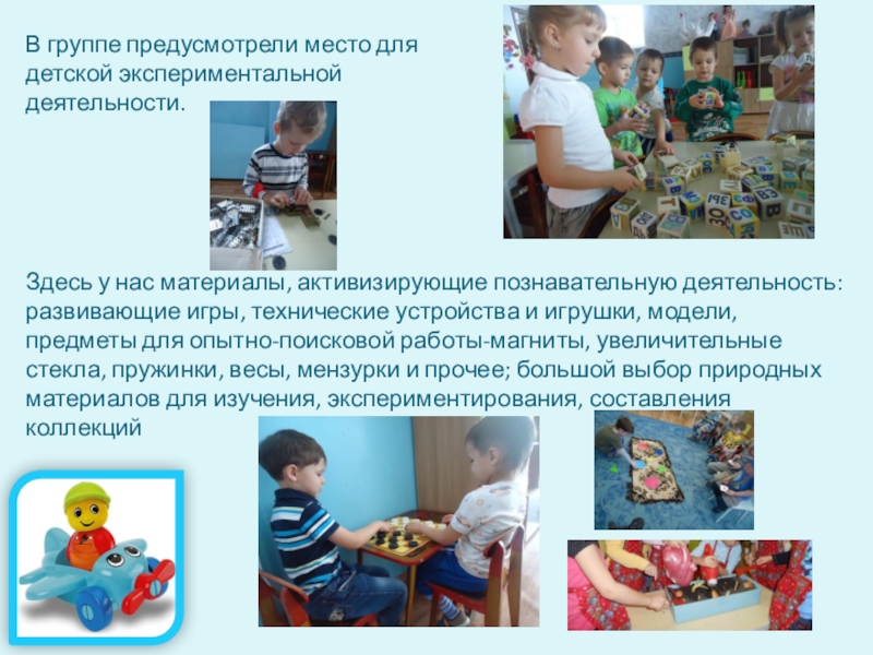 и игрушки, модели, предметы для опытно-поисковой работы-магниты, увеличительные стекла, пружинки, весы, мензурки и прочее; большой выбор природных материалов для изучения, экспериментирования, составления коллекций