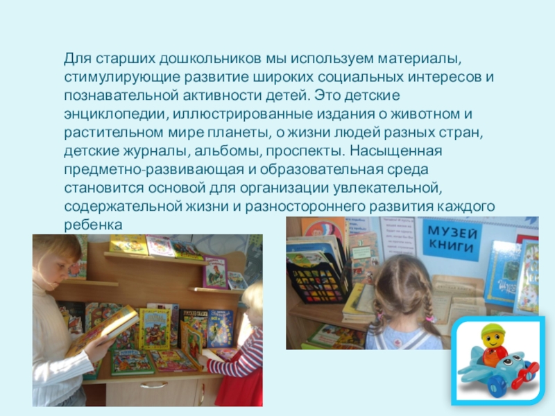 и познавательной активности детей. Это детские энциклопедии, иллюстрированные издания о животном и растительном мире планеты, о жизни людей разных стран, детские журналы, альбомы, проспекты. Насыщенная предметно-развивающая и образовательная среда становится основой для организации увлекательной, содержательной жизни и разностороннего развития каждого ребенка