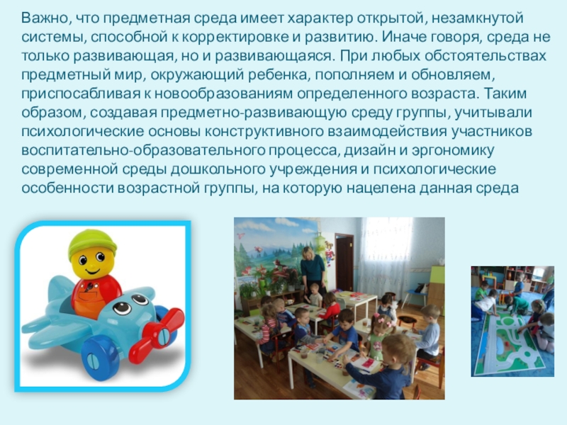 корректировке и развитию. Иначе говоря, среда не только развивающая, но и развивающаяся. При любых обстоятельствах предметный мир, окружающий ребенка, пополняем и обновляем, приспосабливая к новообразованиям определенного возраста. Таким образом, создавая предметно-развивающую среду группы, учитывали психологические основы конструктивного взаимодействия участников воспитательно-образовательного процесса, дизайн и эргономику современной среды дошкольного учреждения и психологические особенности возрастной группы, на которую нацелена данная среда