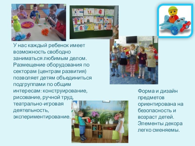 оборудования по секторам (центрам развития) позволяет детям объединиться подгруппами по общим интересам: конструирование, рисование, ручной труд, театрально-игровая деятельность, экспериментирование.