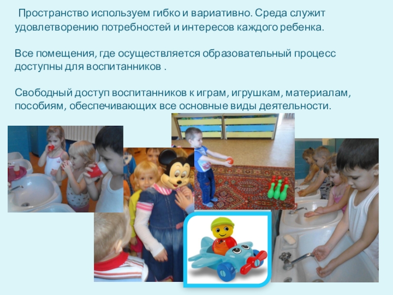 Слайд 6 Пространство используем гибко и вариативно. Среда служит удовлетворению потребностей и