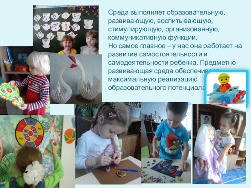 Слайд 5Среда выполняет образовательную, развивающую, воспитывающую, стимулирующую, организованную, коммуникативную функции.