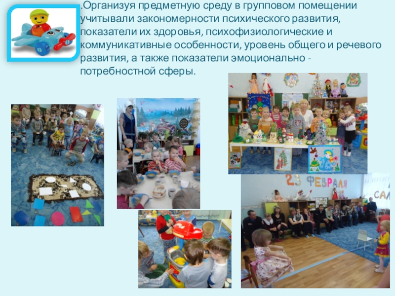 Слайд 9.Организуя предметную среду в групповом помещении учитывали закономерности психического развития, показатели