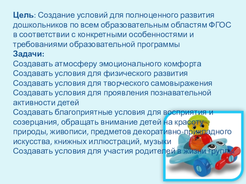 Слайд 2Цель: Создание условий для полноценного развития дошкольников по всем образовательным областям