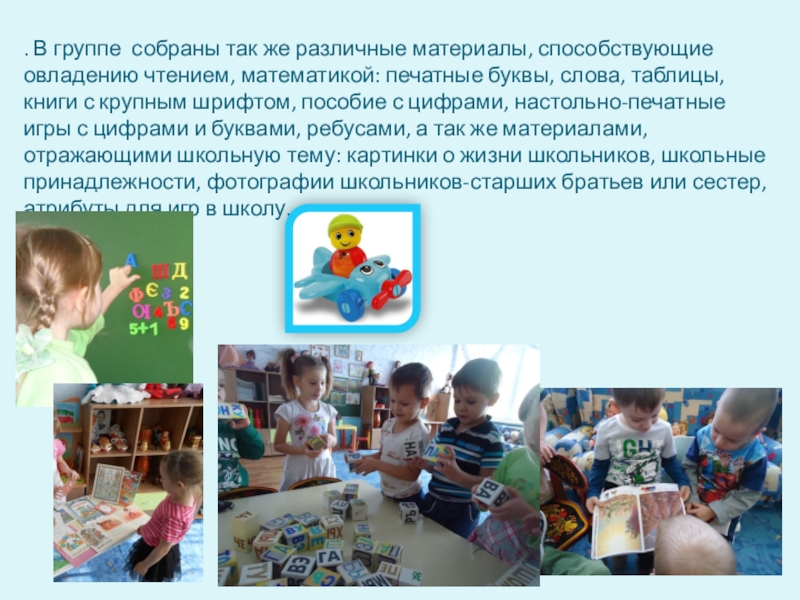 математикой: печатные буквы, слова, таблицы, книги с крупным шрифтом, пособие с цифрами, настольно-печатные игры с цифрами и буквами, ребусами, а так же материалами, отражающими школьную тему: картинки о жизни школьников, школьные принадлежности, фотографии школьников-старших братьев или сестер, атрибуты для игр в школу.