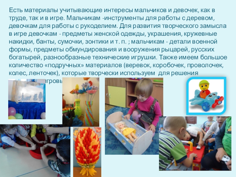 и в игре. Мальчикам -инструменты для работы с деревом, девочкам для работы с рукоделием. Для развития творческого замысла в игре девочкам - предметы женской одежды, украшения, кружевные накидки, банты, сумочки, зонтики и т. п. ; мальчикам - детали военной формы, предметы обмундирования и вооружения рыцарей, русских богатырей, разнообразные технические игрушки. Также имеем большое количество «подручных» материалов (веревок, коробочек, проволочек, колес, ленточек), которые творчески используем для решения различных игровых проблем.