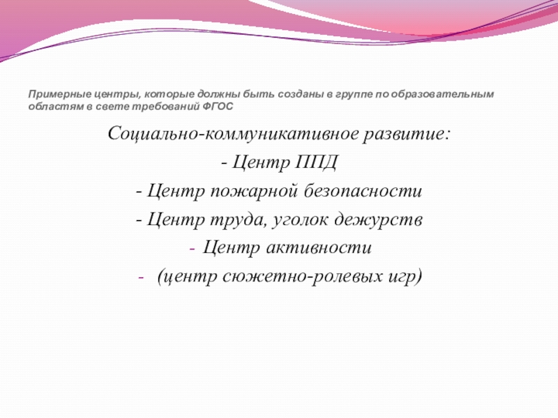 Слайд 17Примерные центры, которые должны быть созданы в группе по образовательным областям