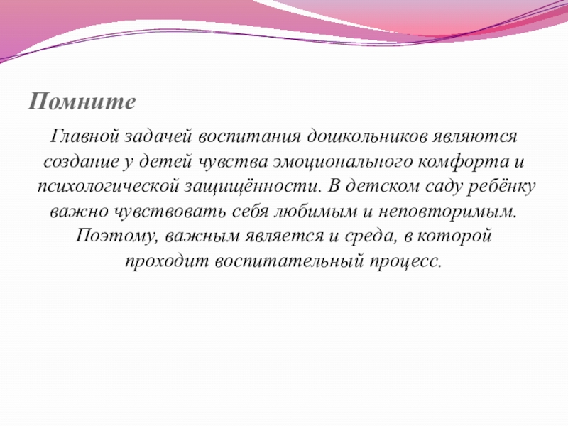 комфорта и психологической защищённости. В детском саду ребёнку важно чувствовать себя любимым и неповторимым. Поэтому, важным является и среда, в которой проходит воспитательный процесс.