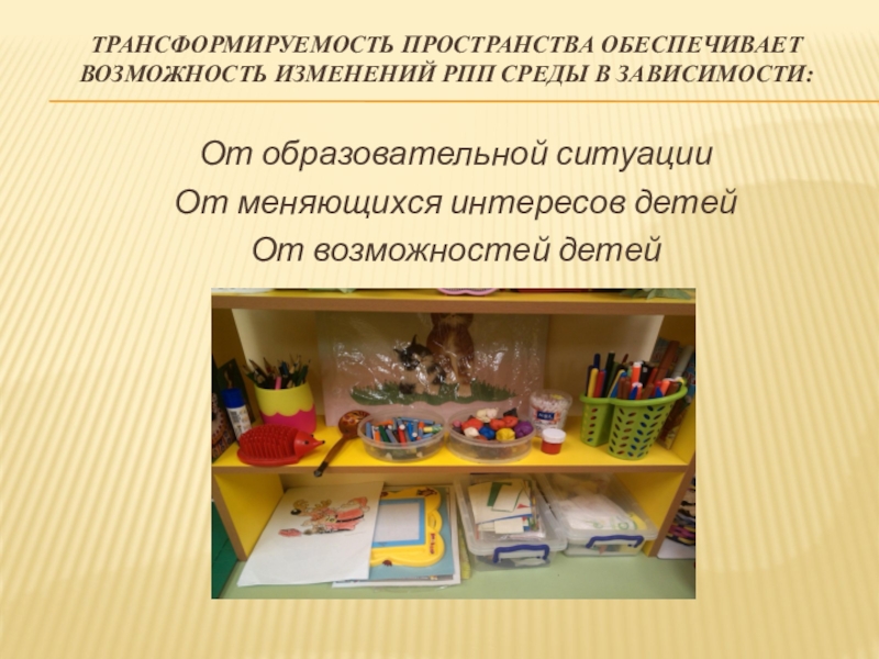 Слайд 12Трансформируемость пространства обеспечивает возможность изменений РПП среды в зависимости:
