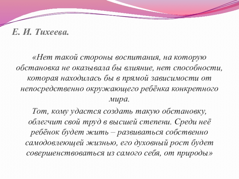 Тот, кому удастся создать такую обстановку, облегчит свой труд в высшей степени. Среди неё ребёнок будет жить – развиваться собственно самодовлеющей жизнью, его духовный рост будет совершенствоваться из самого себя, от природы»