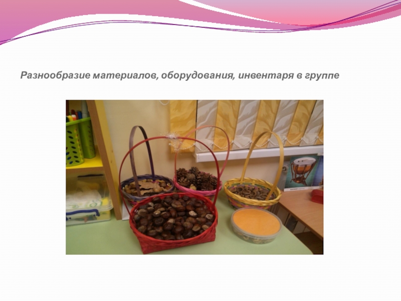 Слайд 11Разнообразие материалов, оборудования, инвентаря в группе
