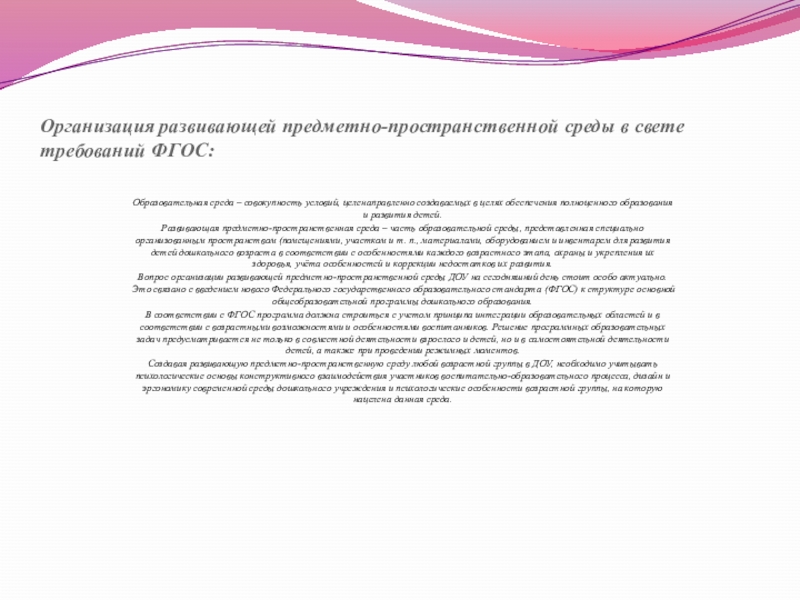 Слайд 3Организация развивающей предметно-пространственной среды в свете требований ФГОС: