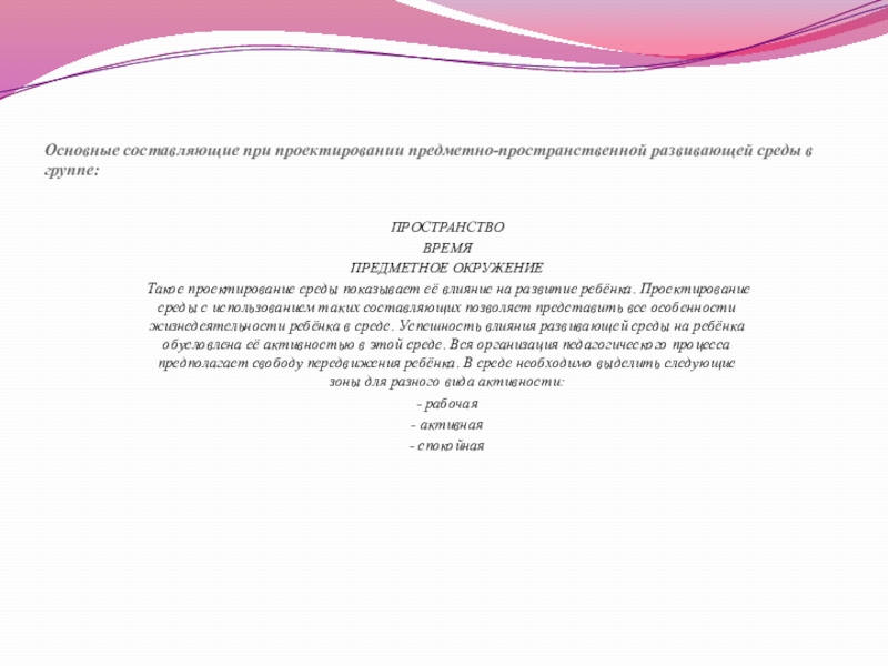 среды показывает её влияние на развитие ребёнка. Проектирование среды с использованием таких составляющих позволяет представить все особенности жизнедеятельности ребёнка в среде. Успешность влияния развивающей среды на ребёнка обусловлена её активностью в этой среде. Вся организация педагогического процесса предполагает свободу передвижения ребёнка. В среде необходимо выделить следующие зоны для разного вида активности:
