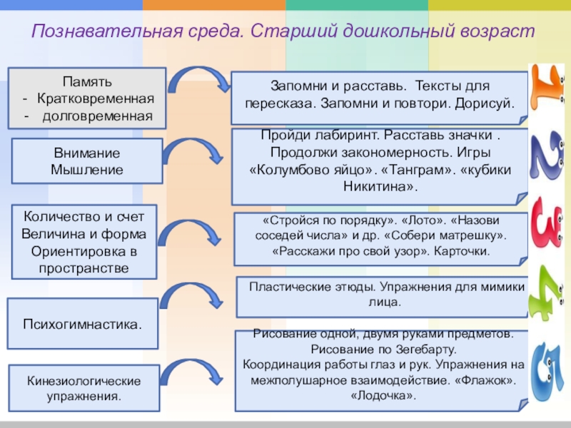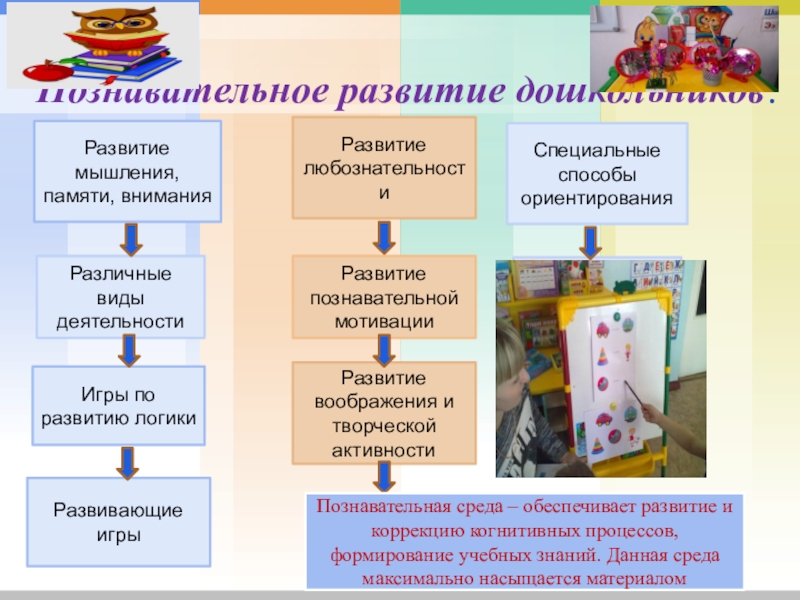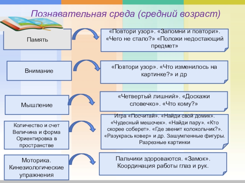 Познавательная среда – обеспечивает развитие и коррекцию когнитивных процессов, формирование учебных знаний. Данная среда максимально насыщается материалом