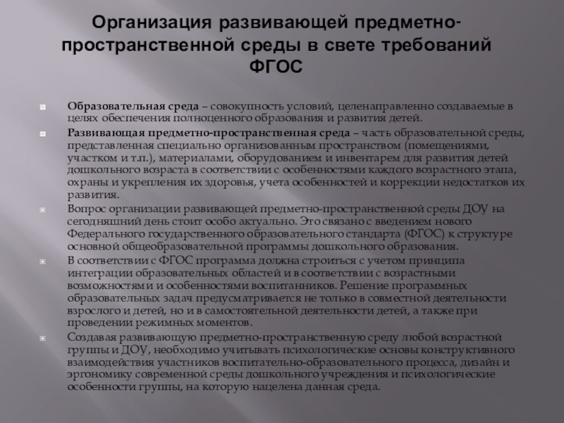 Создавая развивающую предметно-пространственную среду любой возрастной группы и ДОУ, необходимо учитывать психологические основы конструктивного взаимодействия участников воспитательно-образовательного процесса, дизайн и эргономику современной среды дошкольного учреждения и психологические особенности группы, на которую нацелена данная среда.