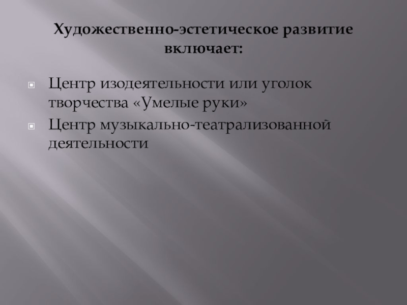 Слайд 19Художественно-эстетическое развитие включает: