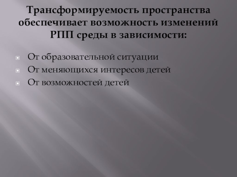 Слайд 11Трансформируемость пространства обеспечивает возможность изменений РПП среды в зависимости:
