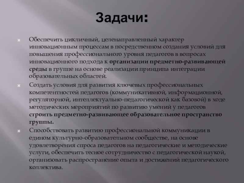 Обеспечить цикличный, целенаправленный характер инновационным процессам в посредственном создания условий для
