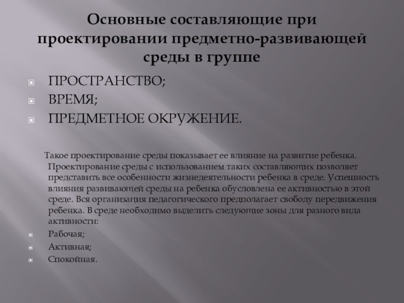Слайд 7Основные составляющие при проектировании предметно-развивающей среды в группе