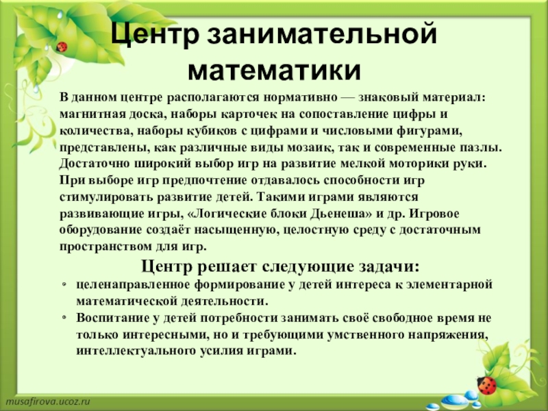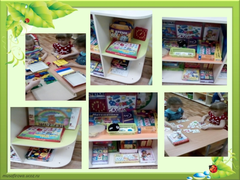 доска, наборы карточек на сопоставление цифры и количества, наборы кубиков с цифрами и числовыми фигурами, представлены, как различные виды мозаик, так и современные пазлы. Достаточно широкий выбор игр на развитие мелкой моторики руки. При выборе игр предпочтение отдавалось способности игр стимулировать развитие детей. Такими играми являются развивающие игры, «Логические блоки Дьенеша» и др. Игровое оборудование создаёт насыщенную, целостную среду с достаточным пространством для игр.