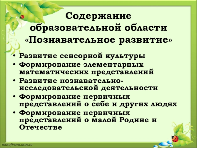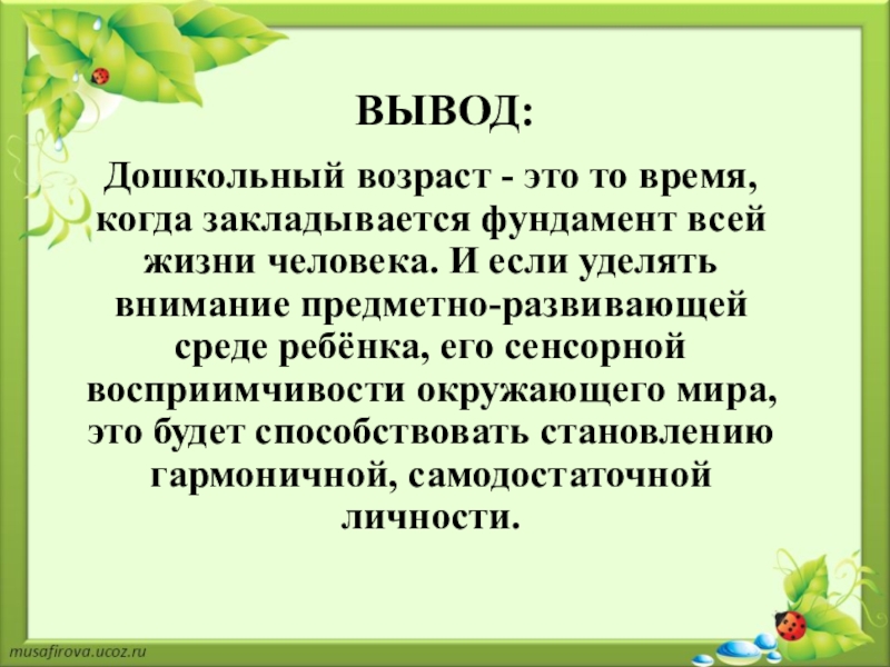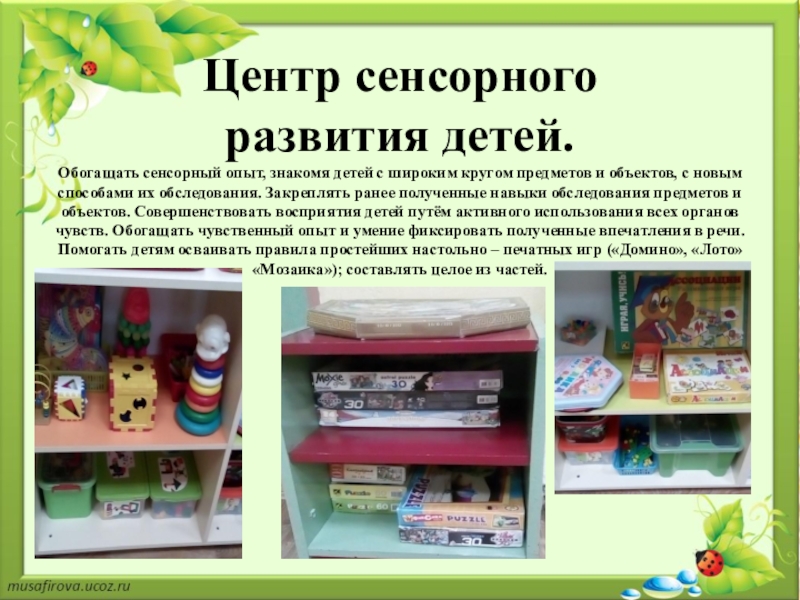 всей жизни человека. И если уделять внимание предметно-развивающей среде ребёнка, его сенсорной восприимчивости окружающего мира, это будет способствовать становлению гармоничной, самодостаточной личности.
