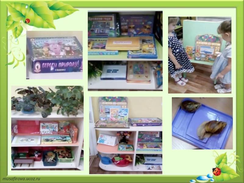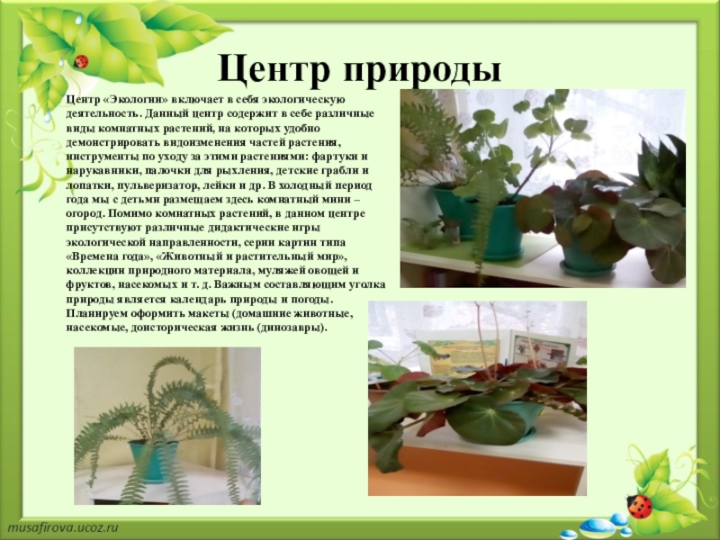 в себе различные виды комнатных растений, на которых удобно демонстрировать видоизменения частей растения, инструменты по уходу за этими растениями: фартуки и нарукавники, палочки для рыхления, детские грабли и лопатки, пульверизатор, лейки и др. В холодный период года мы с детьми размещаем здесь комнатный мини – огород. Помимо комнатных растений, в данном центре присутствуют различные дидактические игры экологической направленности, серии картин типа «Времена года», «Животный и растительный мир», коллекции природного материала, муляжей овощей и фруктов, насекомых и т. д. Важным составляющим уголка природы является календарь природы и погоды. Планируем оформить макеты (домашние животные, насекомые, доисторическая жизнь (динозавры).