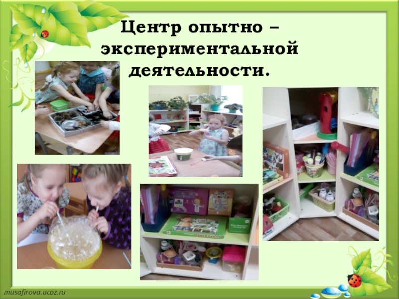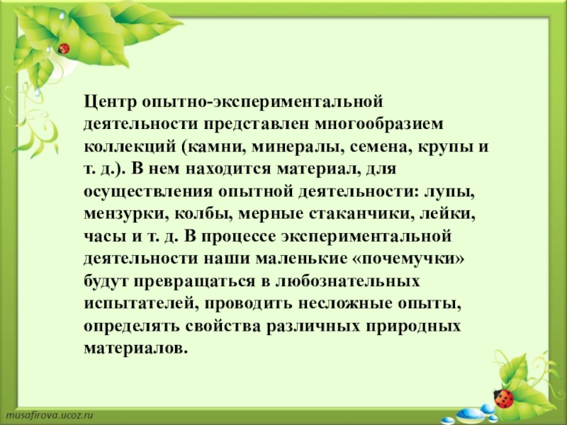 т. д.). В нем находится материал, для осуществления опытной деятельности: лупы, мензурки, колбы, мерные стаканчики, лейки, часы и т. д. В процессе экспериментальной деятельности наши маленькие «почемучки» будут превращаться в любознательных испытателей, проводить несложные опыты, определять свойства различных природных материалов.