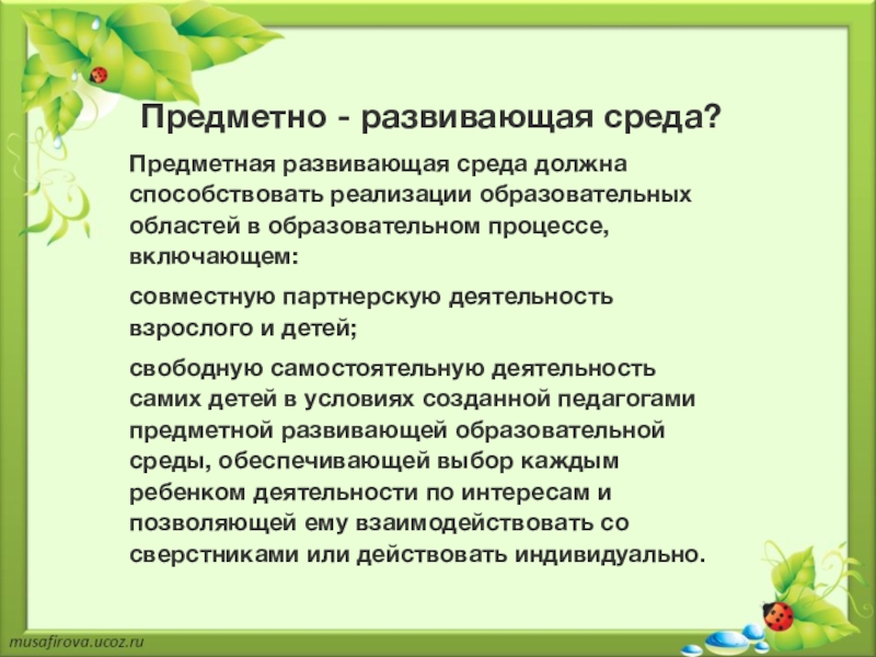 Предметная развивающая среда должна способствовать реализации образовательных областей