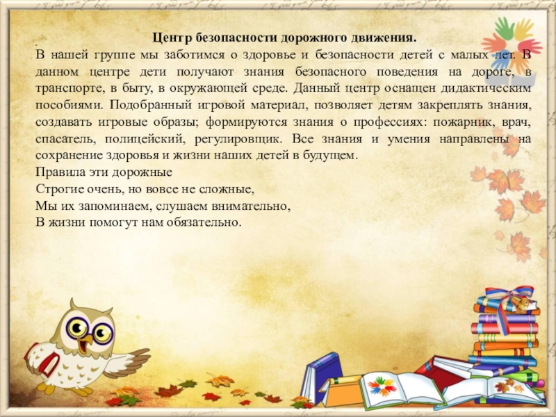 безопасности детей с малых лет. В данном центре дети получают знания безопасного поведения на дороге, в транспорте, в быту, в окружающей среде. Данный центр оснащен дидактическим пособиями. Подобранный игровой материал, позволяет детям закреплять знания, создавать игровые образы; формируются знания о профессиях: пожарник, врач, спасатель, полицейский, регулировщик. Все знания и умения направлены на сохранение здоровья и жизни наших детей в будущем.