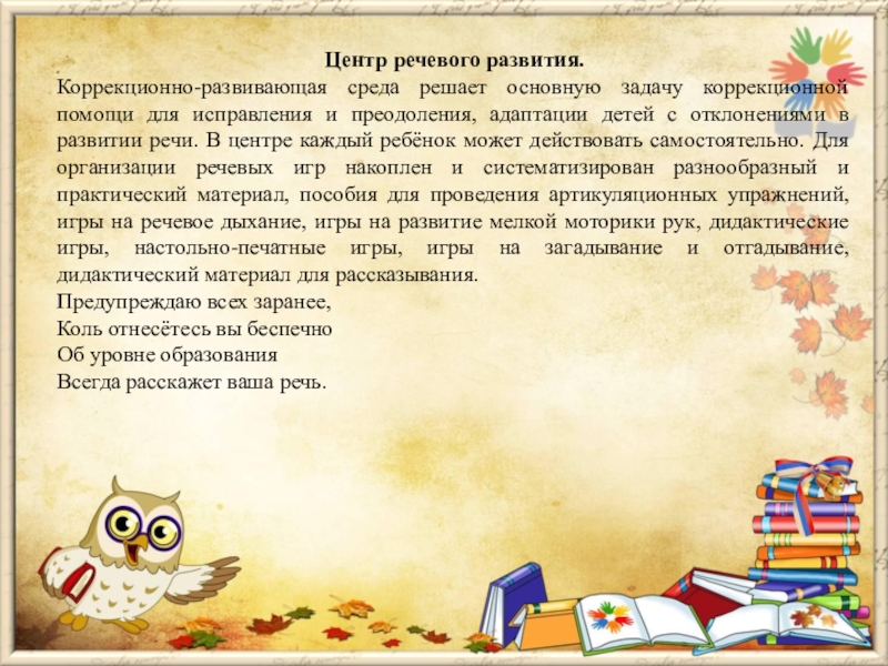 и преодоления, адаптации детей с отклонениями в развитии речи. В центре каждый ребёнок может действовать самостоятельно. Для организации речевых игр накоплен и систематизирован разнообразный и практический материал, пособия для проведения артикуляционных упражнений, игры на речевое дыхание, игры на развитие мелкой моторики рук, дидактические игры, настольно-печатные игры, игры на загадывание и отгадывание, дидактический материал для рассказывания.