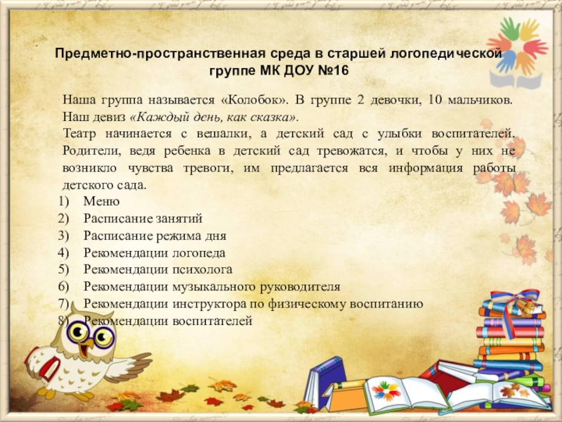 Слайд 3Предметно-пространственная среда в старшей логопедической группе МК ДОУ №16