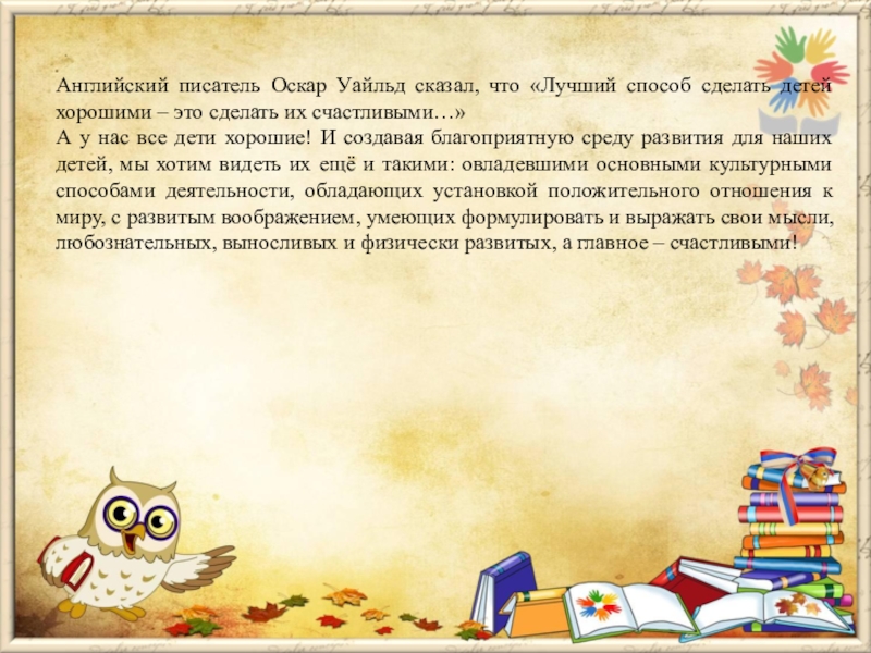 А у нас все дети хорошие! И создавая благоприятную среду развития для наших детей, мы хотим видеть их ещё и такими: овладевшими основными культурными способами деятельности, обладающих установкой положительного отношения к миру, с развитым воображением, умеющих формулировать и выражать свои мысли, любознательных, выносливых и физически развитых, а главное – счастливыми!