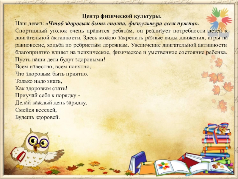 Наш девиз: «Чтоб здоровым быть сполна, физкультура всем нужна».