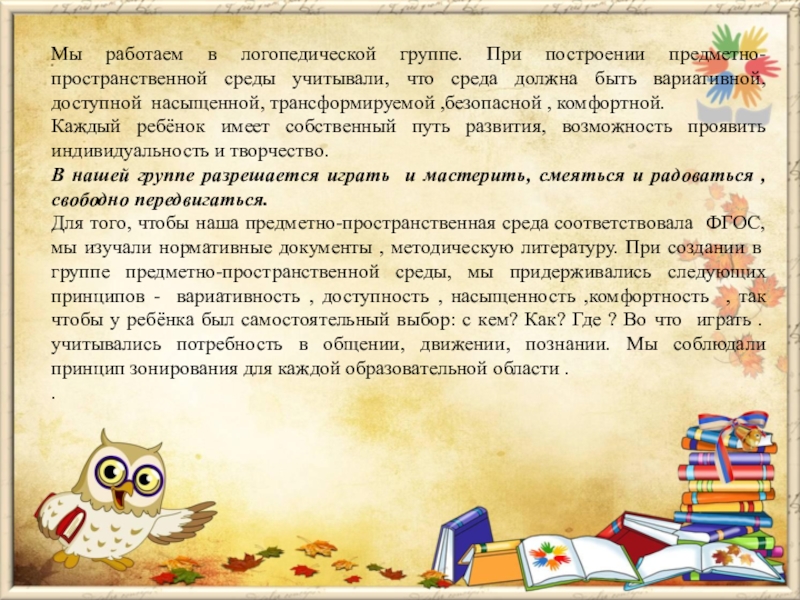 Слайд 5Мы работаем в логопедической группе. При построении предметно-пространственной среды учитывали, что