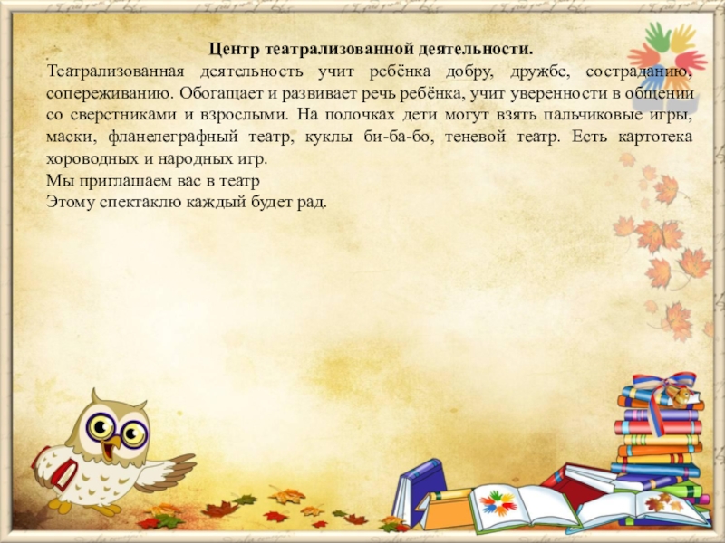 Театрализованная деятельность учит ребёнка добру, дружбе, состраданию, сопереживанию. Обогащает