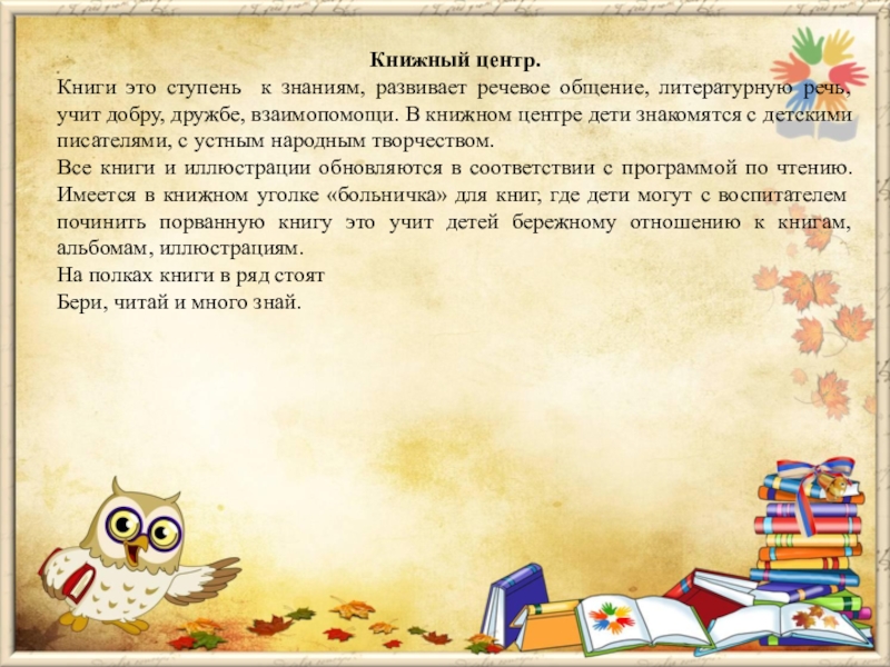 учит добру, дружбе, взаимопомощи. В книжном центре дети знакомятся с детскими писателями, с устным народным творчеством.