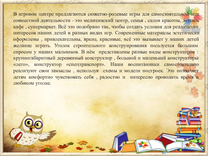 Слайд 8В игровом центре предлагаются сюжетно-ролевые игры для самостоятельной или совместной деятельности