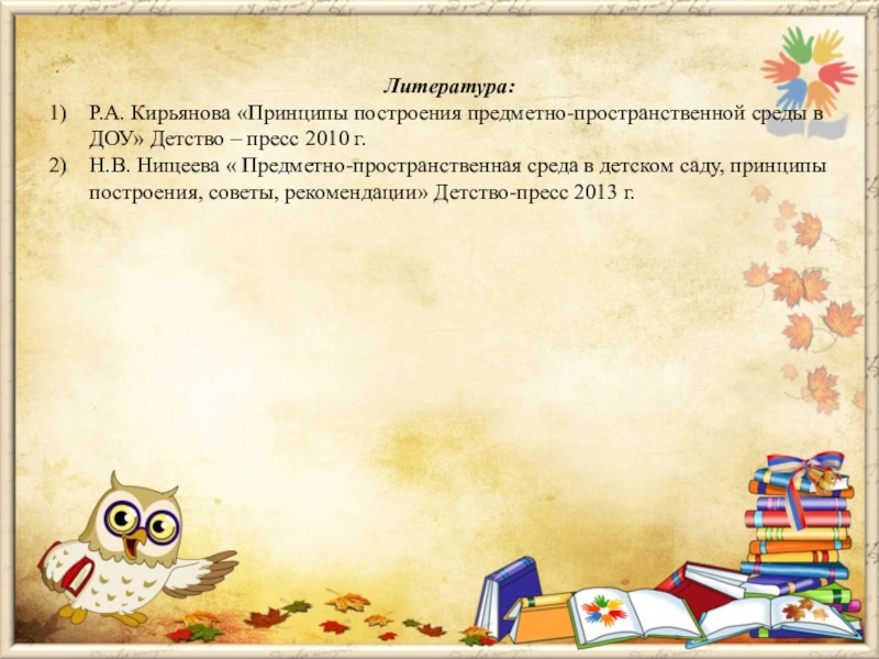 Н.В. Нищеева « Предметно-пространственная среда в детском саду, принципы построения, советы, рекомендации» Детство-пресс 2013 г.
