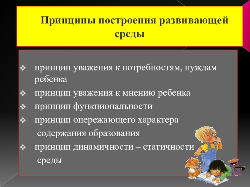 Принципы построения развивающей средыпринцип уважения к потребностям, нуждам ребенкапринцип уважения к мнению ребенкапринцип функциональностипринцип опережающего