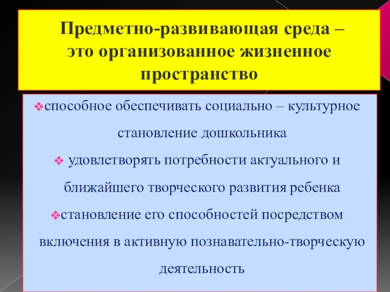 Предметно-развивающая среда – это организованное жизненное пространство способное обеспечивать социально – культурное становление дошкольника удовлетворять потребности актуального и ближайшего творческого развития ребенкастановление его способностей посредством включения в активную познавательно-творческую деятельность