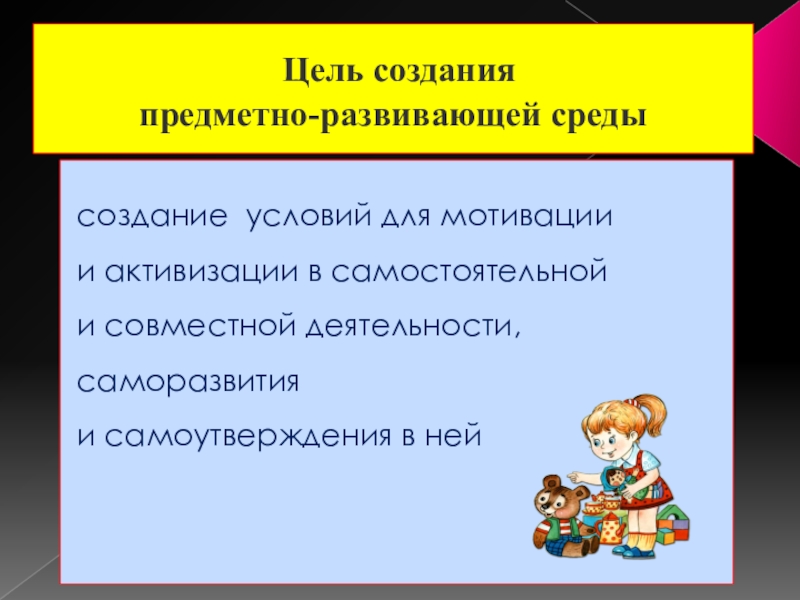 Цель создания  предметно-развивающей среды создание условий для мотивации и активизации в самостоятельной и совместной деятельности,