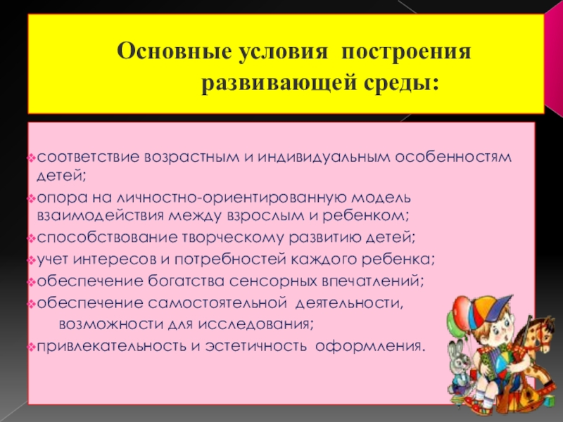 Основные условия построения       развивающей среды:соответствие возрастным и индивидуальным особенностям детей;опора