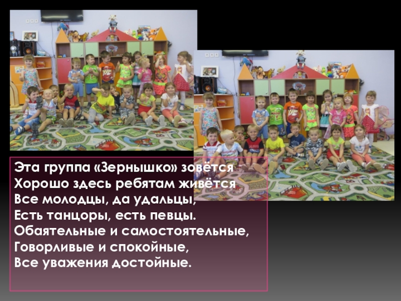 Слайд 8Эта группа «Зернышко» зовётся Хорошо здесь ребятам живётся Все молодцы, да удальцы, Есть танцоры,