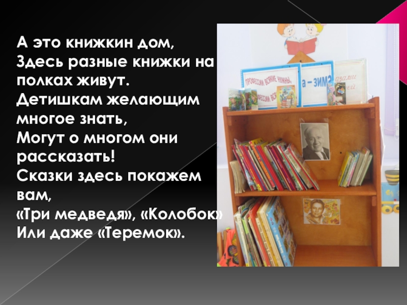 А это книжкин дом, Здесь разные книжки на полках живут. Детишкам желающим многое знать, Могут о многом