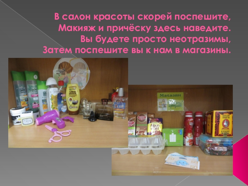 Слайд 10В салон красоты скорей поспешите, Макияж и причёску здесь наведите. Вы будете просто