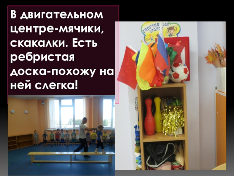 Слайд 21В двигательном центре-мячики, скакалки. Есть ребристая доска-похожу на ней слегка!